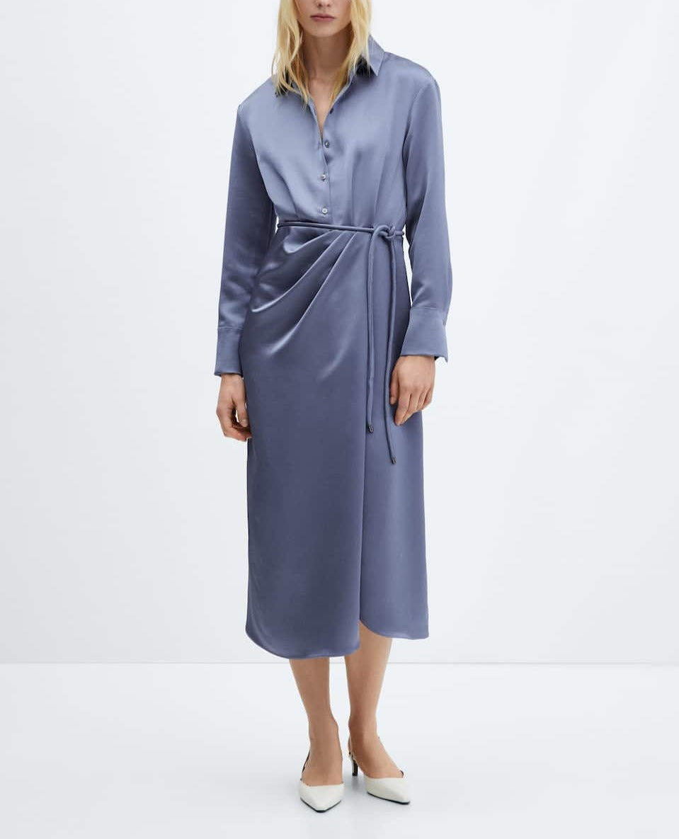 Flowy fabric. Satin. Midi design. Straight design. Shirt-style. Shirt-style collar. Long sleeve with buttoned cuffs. Front button closure. Bow on the waist. Inner lining. Office looks. Prom collection. Party and events collection.