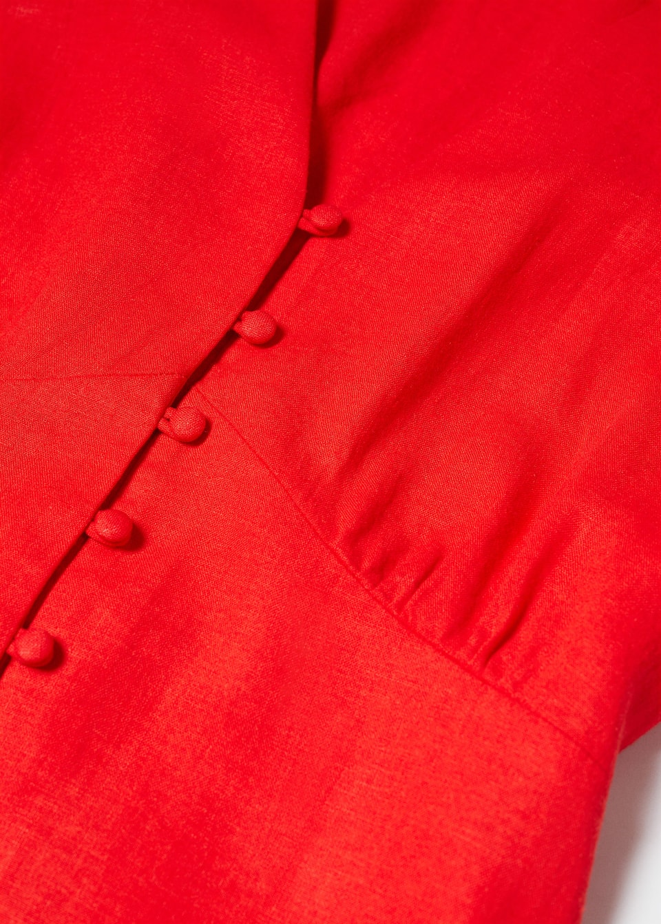 Pure Linen Midi design. Available in plain or floral print. V-neck. Short sleeve. Button fastening on the front section. Adjustable waist tie. Opening in the lower front. Plus Size Available. The beige color is an online exclusive.