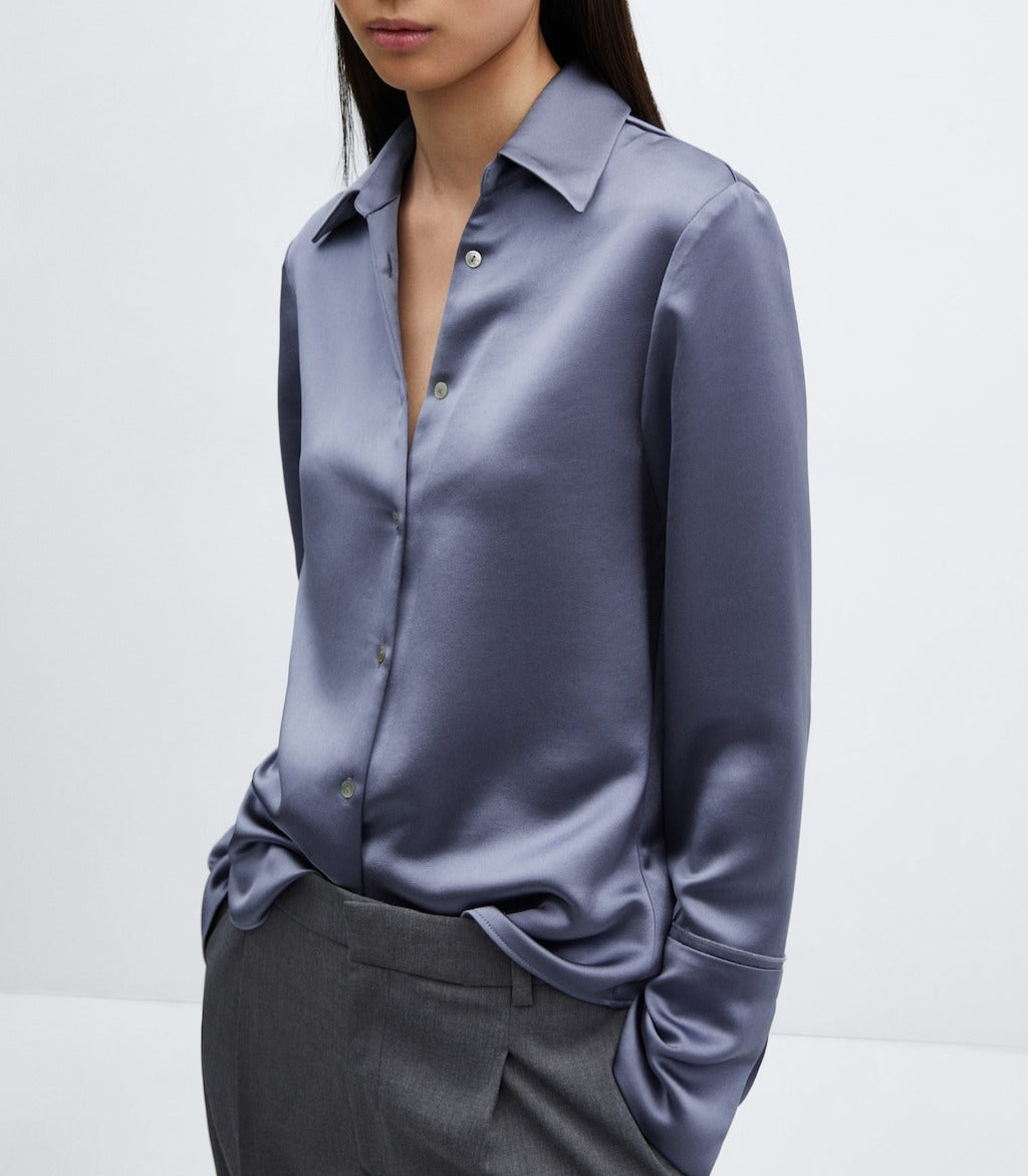 Flowy fabric. Satin. Straight design. Shirt-style collar. Long sleeve. Front button closure. Office looks.