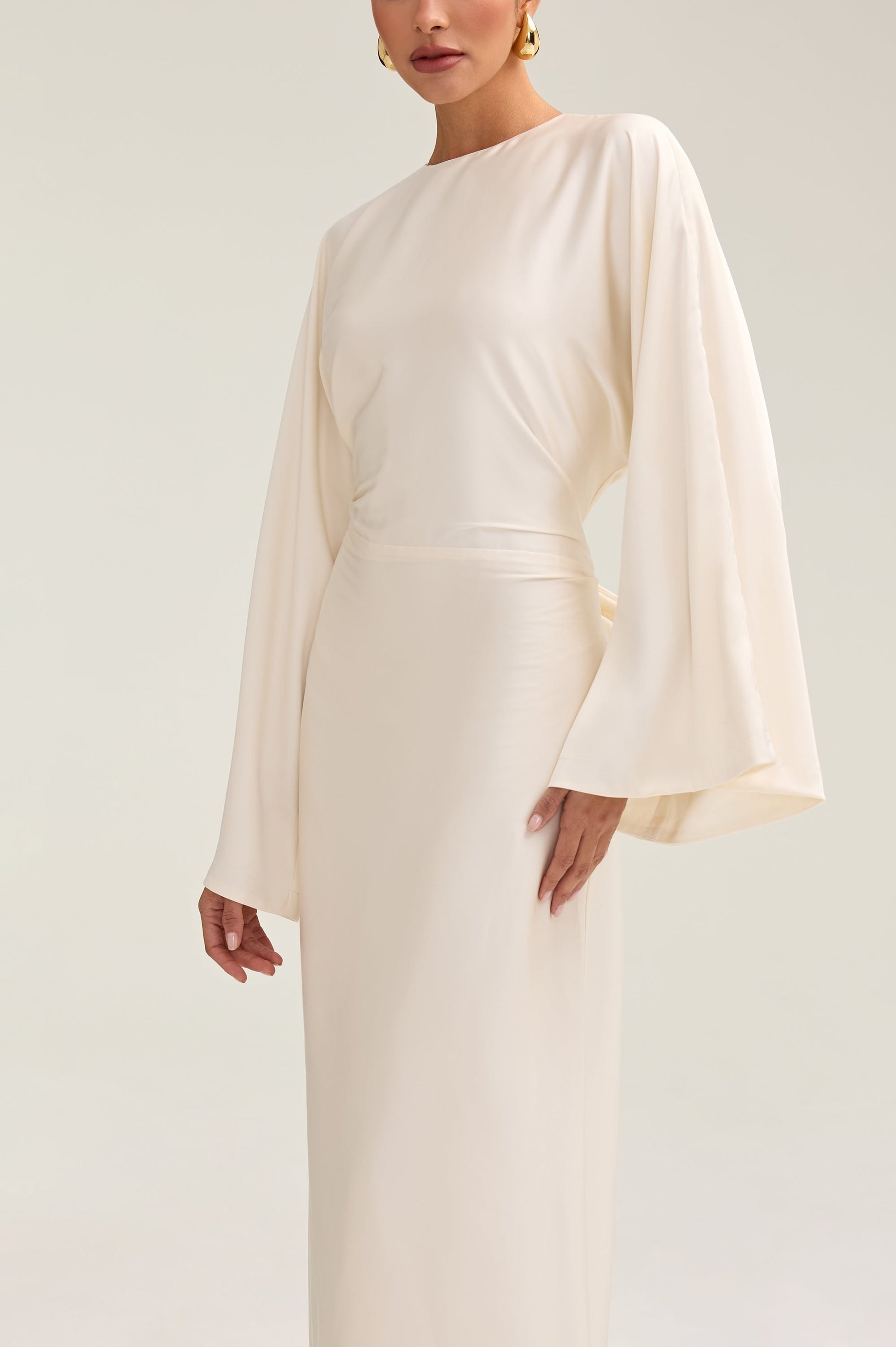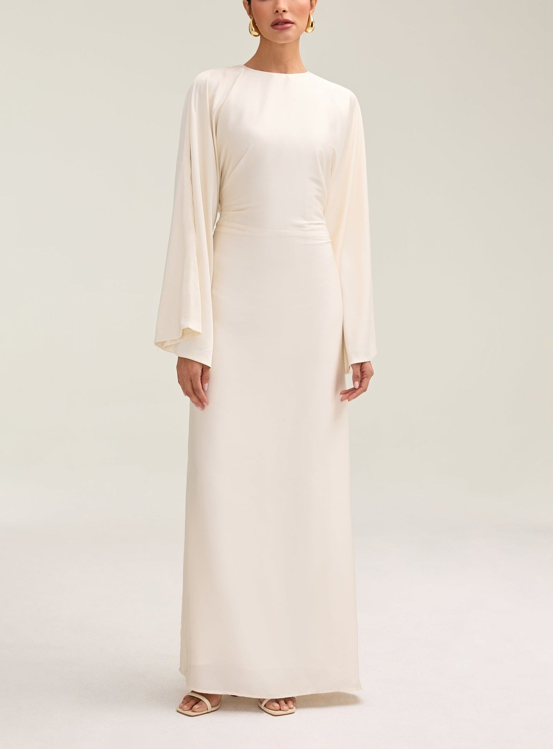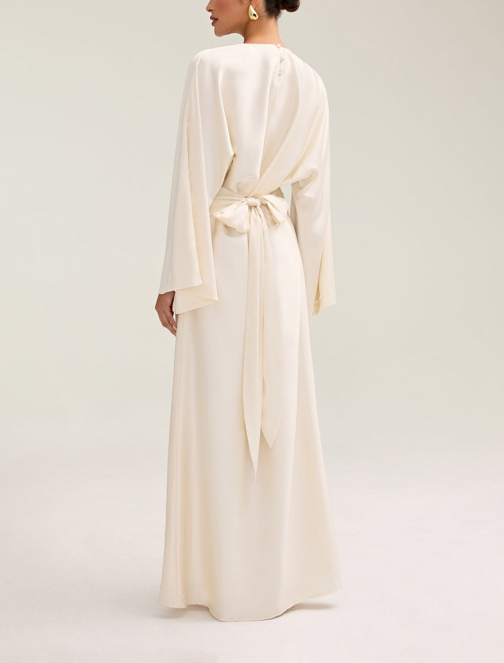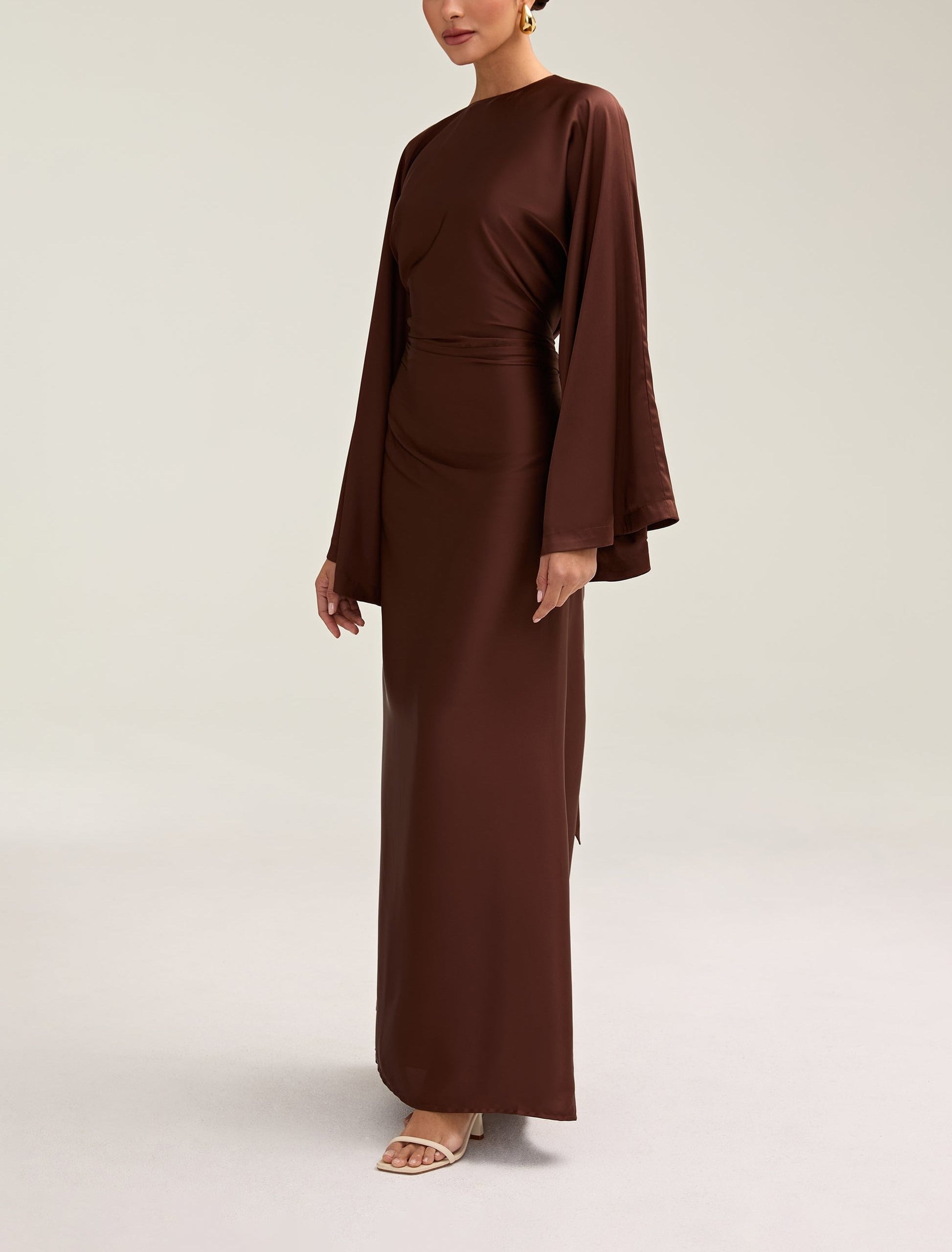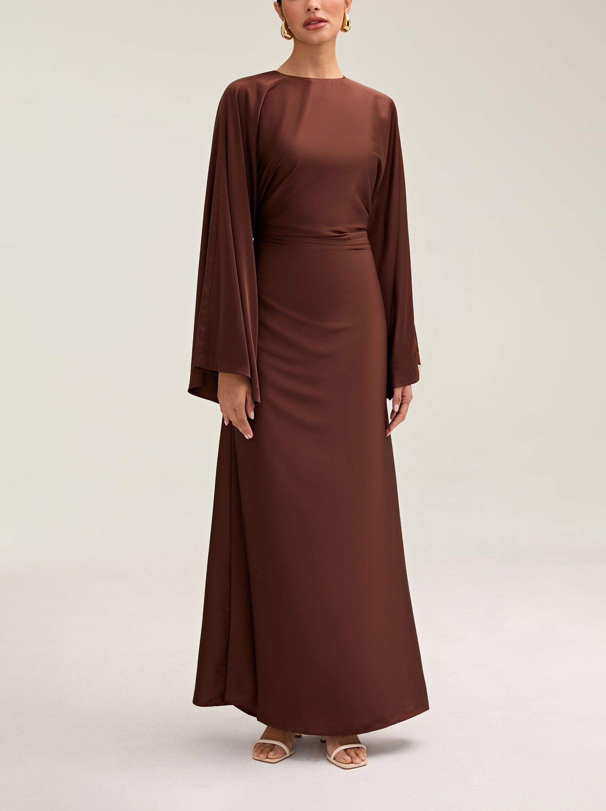 Indulge in luxury with the Satin Maxi Dress. Its loose wide sleeves and lustrous satin fabric exude elegance, while the adjustable tie waist flatters your figure. Versatile design makes it perfect for Eid and beyond. Elevate your style with this exclusive piece.