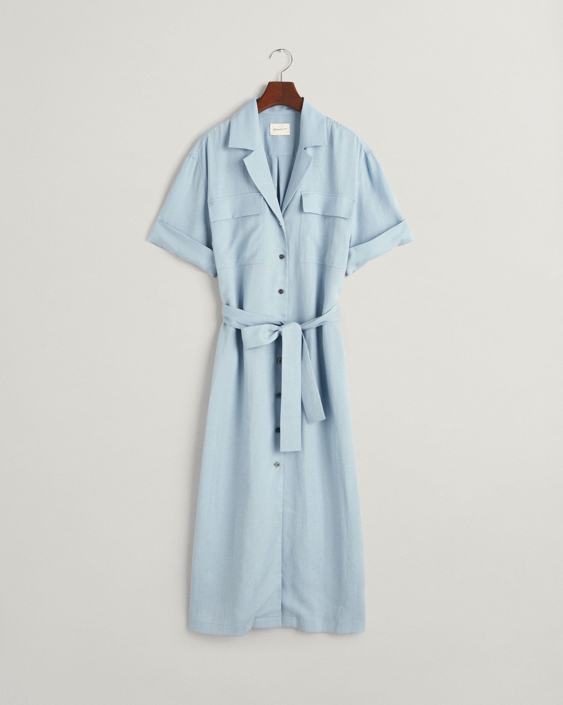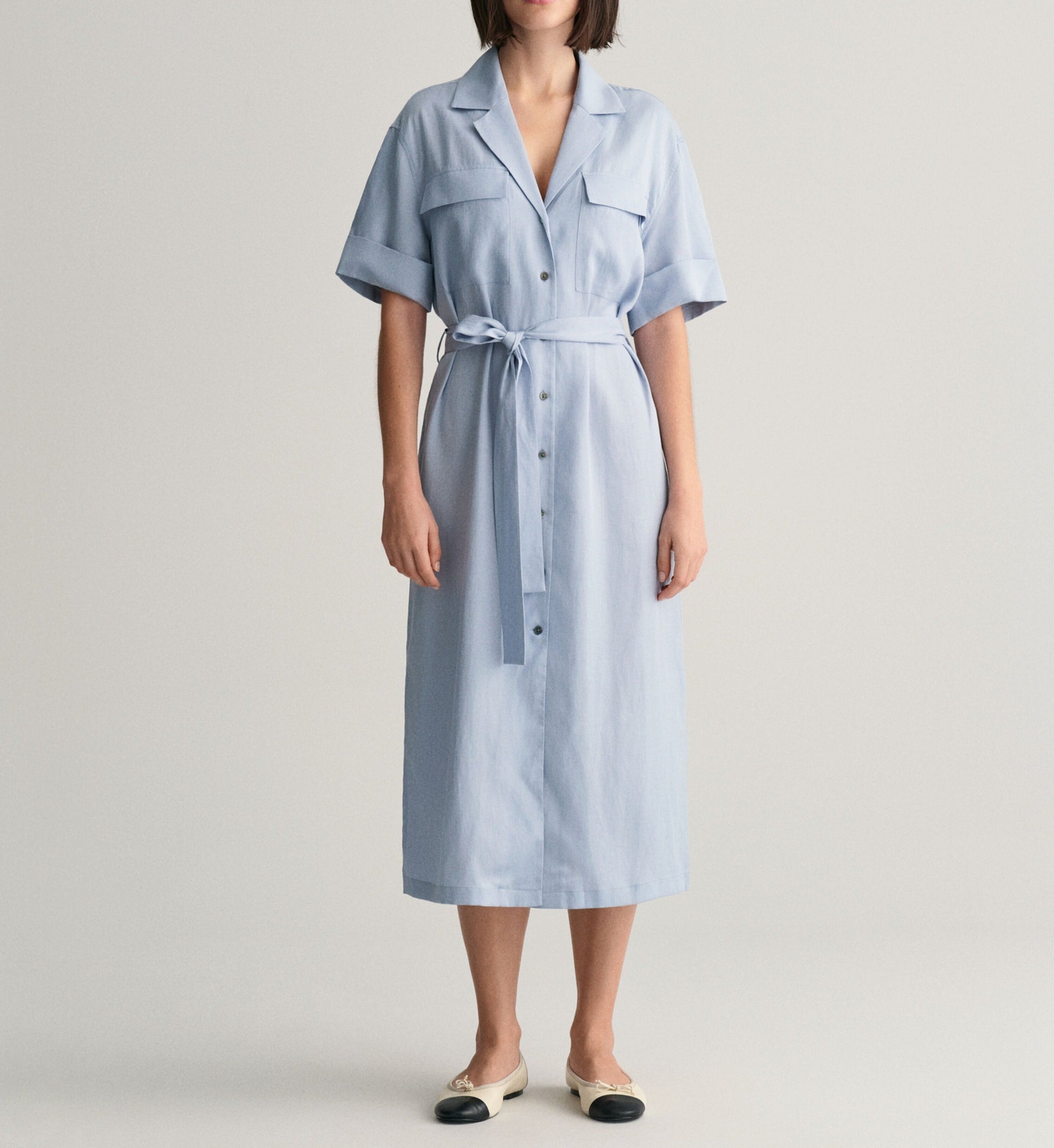 Enhanced by its relaxed silhouette, this midi dress is ideal for days in the sun. Made from a Cotton-linen blend for a soft, fluid feel and draped look, this dress features shirt-inspired details and utility styling. It has a V-neckline with a camp collar, chest flap pockets, folded short sleeves and a belt at the waist. Further details include mother-of-pearl buttons and a box pleat with our signature locker loop at the back. This garment is intended for a relaxed fit. For a closer fit, we recommend sizing down.