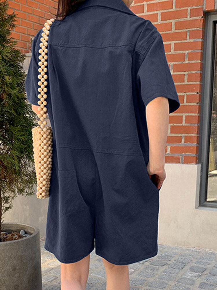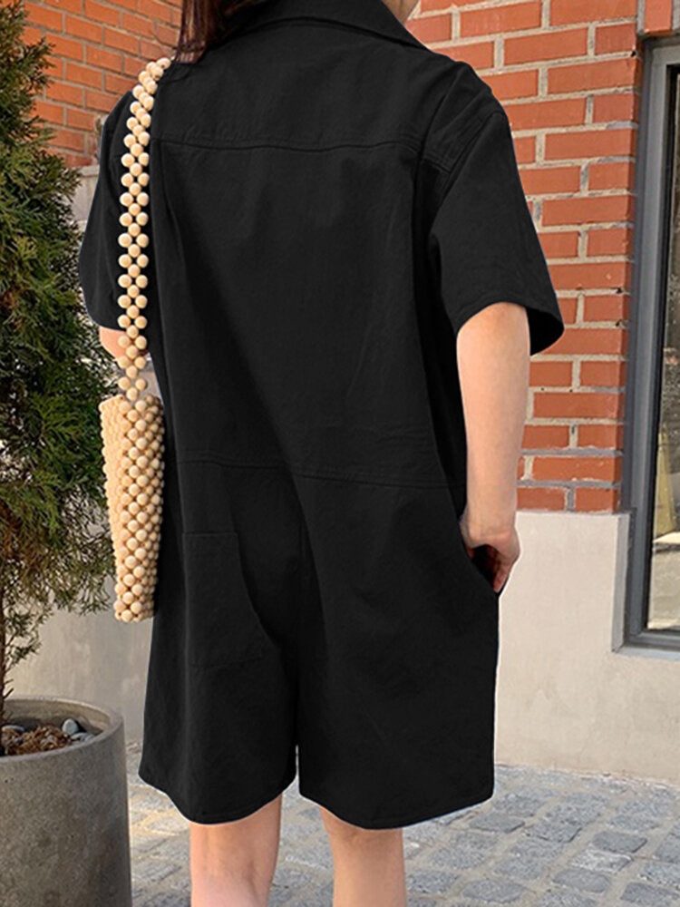 Solid Pocket Button Lapel Short Sleeve Casual Cotton Women Romper